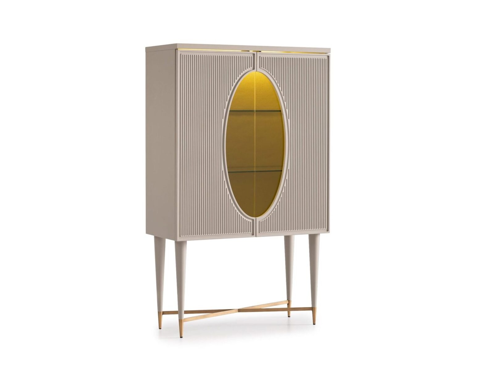 The Casto Bar Cabinet makes a striking statement with its meticulously crafted ribbed doors in cream mat finish. The design features an elegant oval glass panel that creates a sophisticated display window, beautifully framed by the vertical ribbing pattern. The cabinet is enhanced by a dark shiny top that creates a dramatic contrast with the light-toned body.