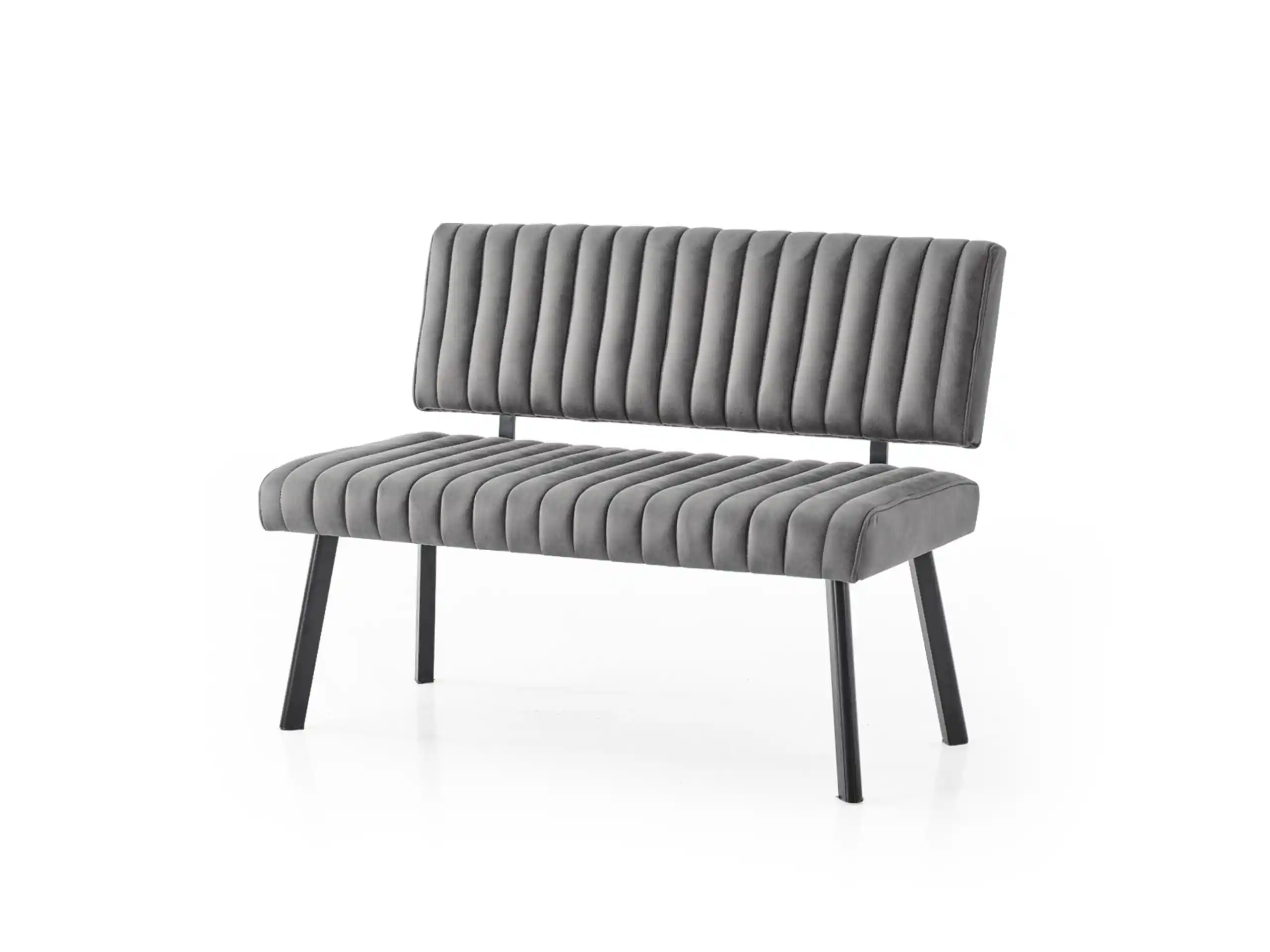 Upholstered in a sophisticated grey velvet-look fabric with elegant vertical channel tufting, this bench adds a touch of hotel-chic to your home.