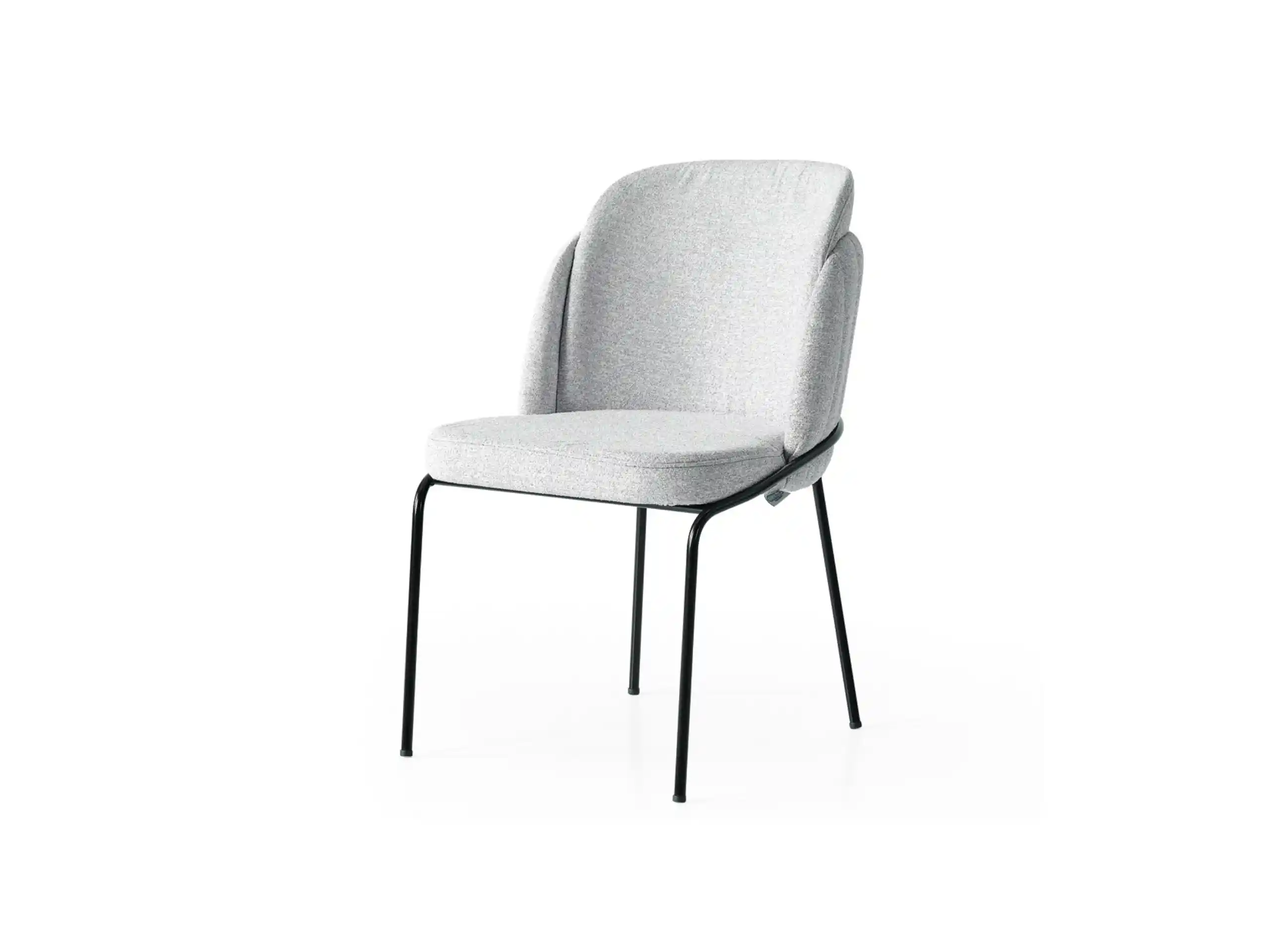 The chair rests on sleek, black-finished metal legs that offer strength and stability while maintaining a contemporary profile. The contrasting textures of the boucle upholstery and the subtle gleam of the metal legs strike a perfect balance between elegance and modern flair.