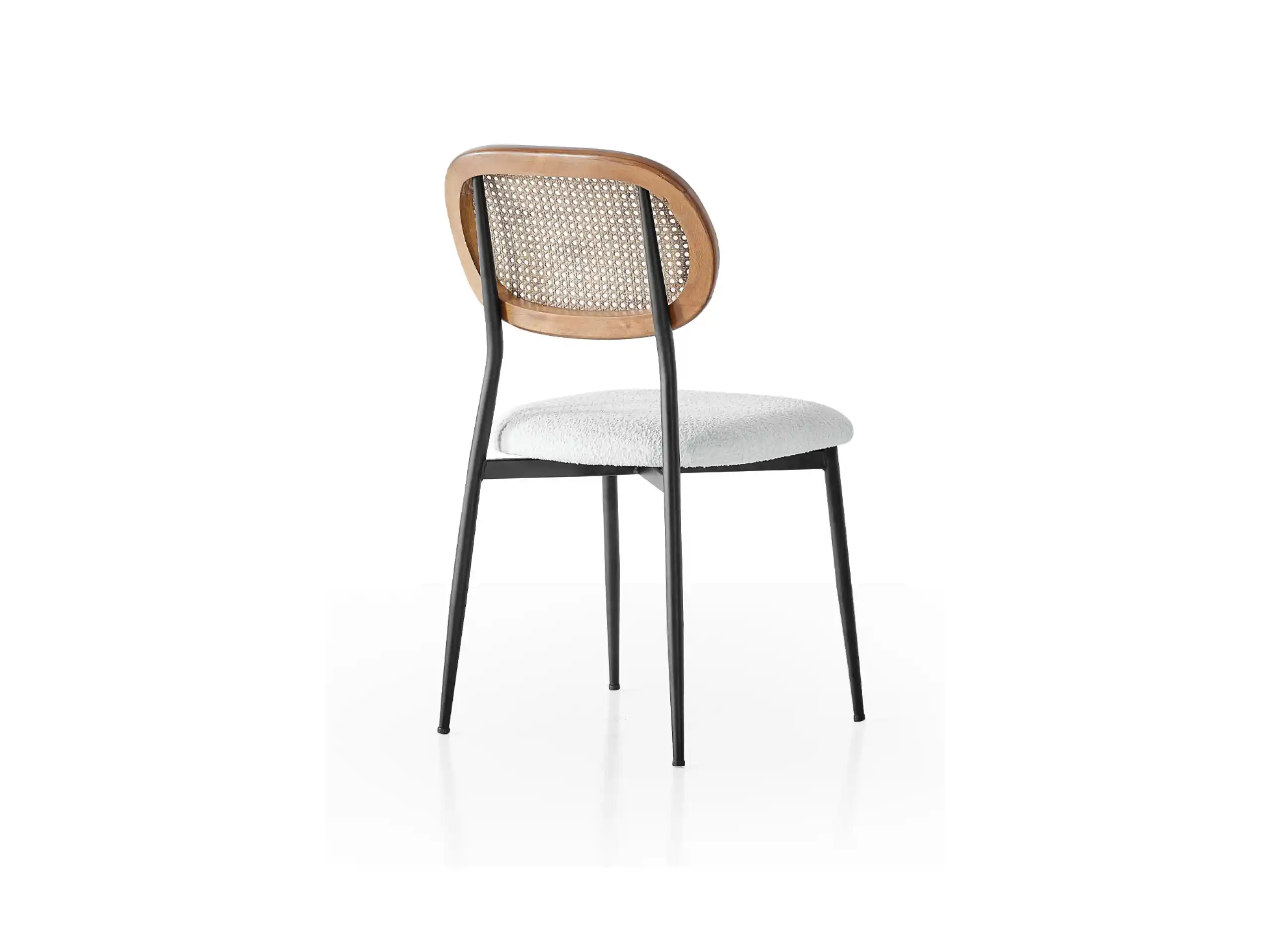 Why settle for ordinary when you can have extraordinary? The Istanbul Ceviz Chair is a masterclass in mixed materials. The natural cane backrest adds an airy, organic feel that lightens up your room, while the walnut wood frame brings warmth and richness. Contrasted with the crisp white boucle seat and sharp black legs, it creates a unique, layered look that is full of character. It’s the perfect way to add personality to a neutral dining space.
