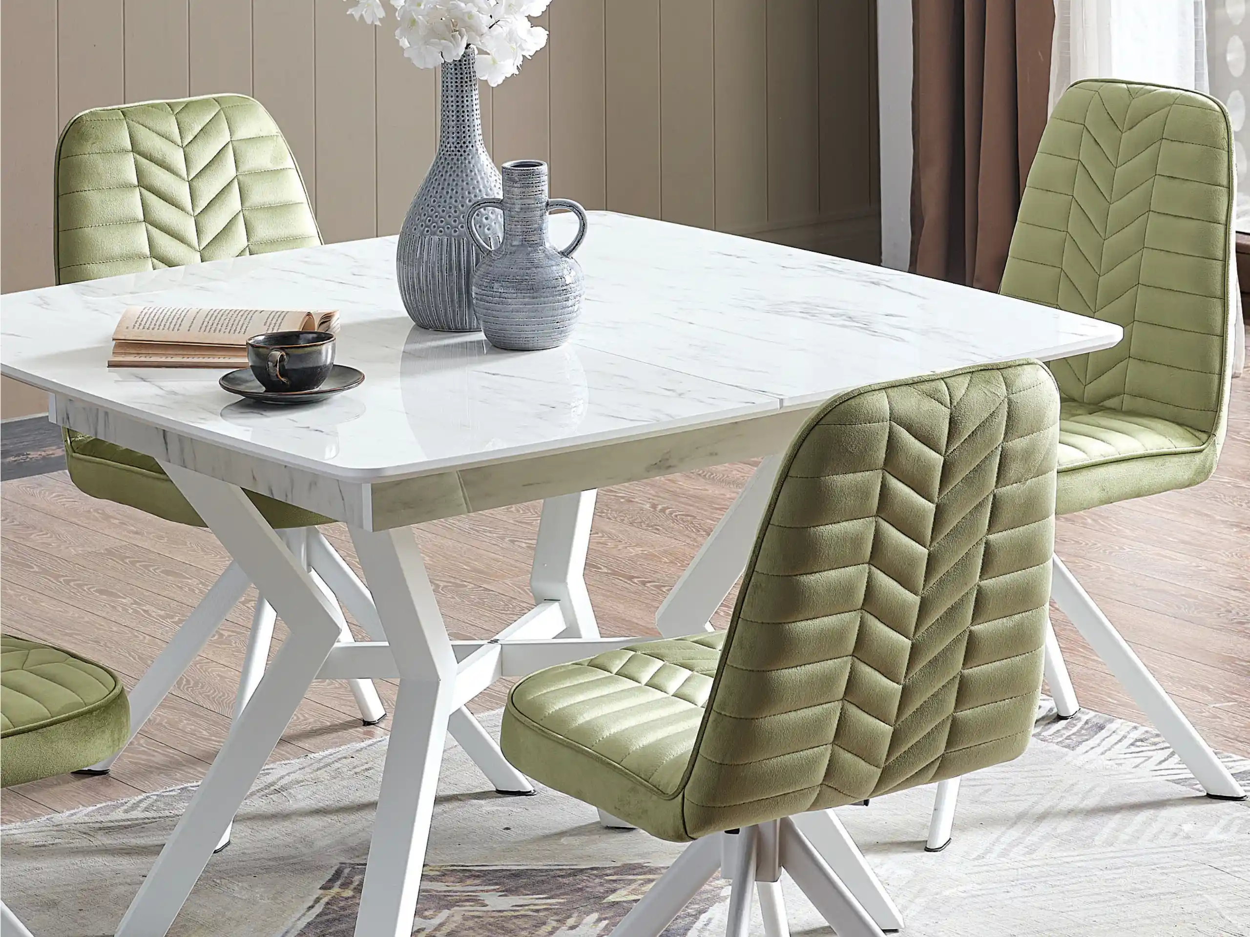 Adal Dining Set features a minimal marble-look table and quilted green chairs—bringing compact style, comfort, and easy upkeep to creative family living.