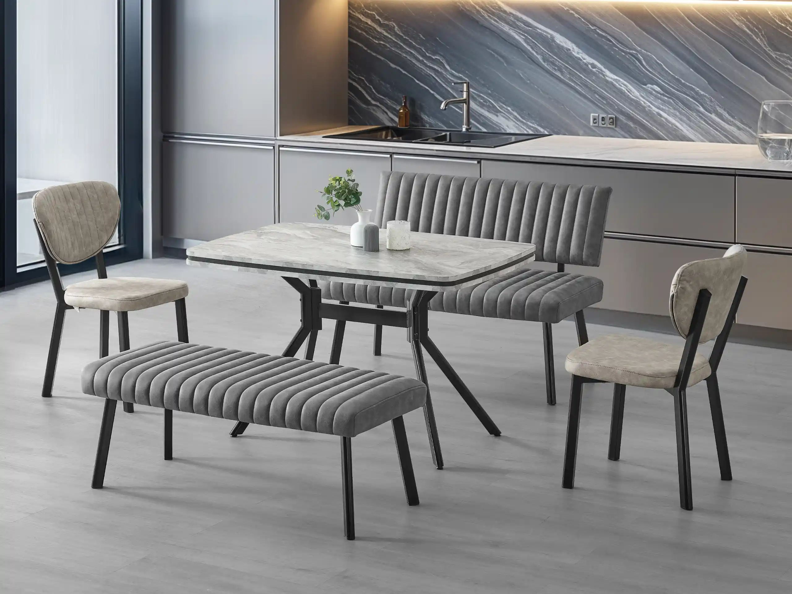 This luxurious 4-seater collection combines the drama of a grey marble-effect table with the relaxed sophistication of a mixed seating arrangement.