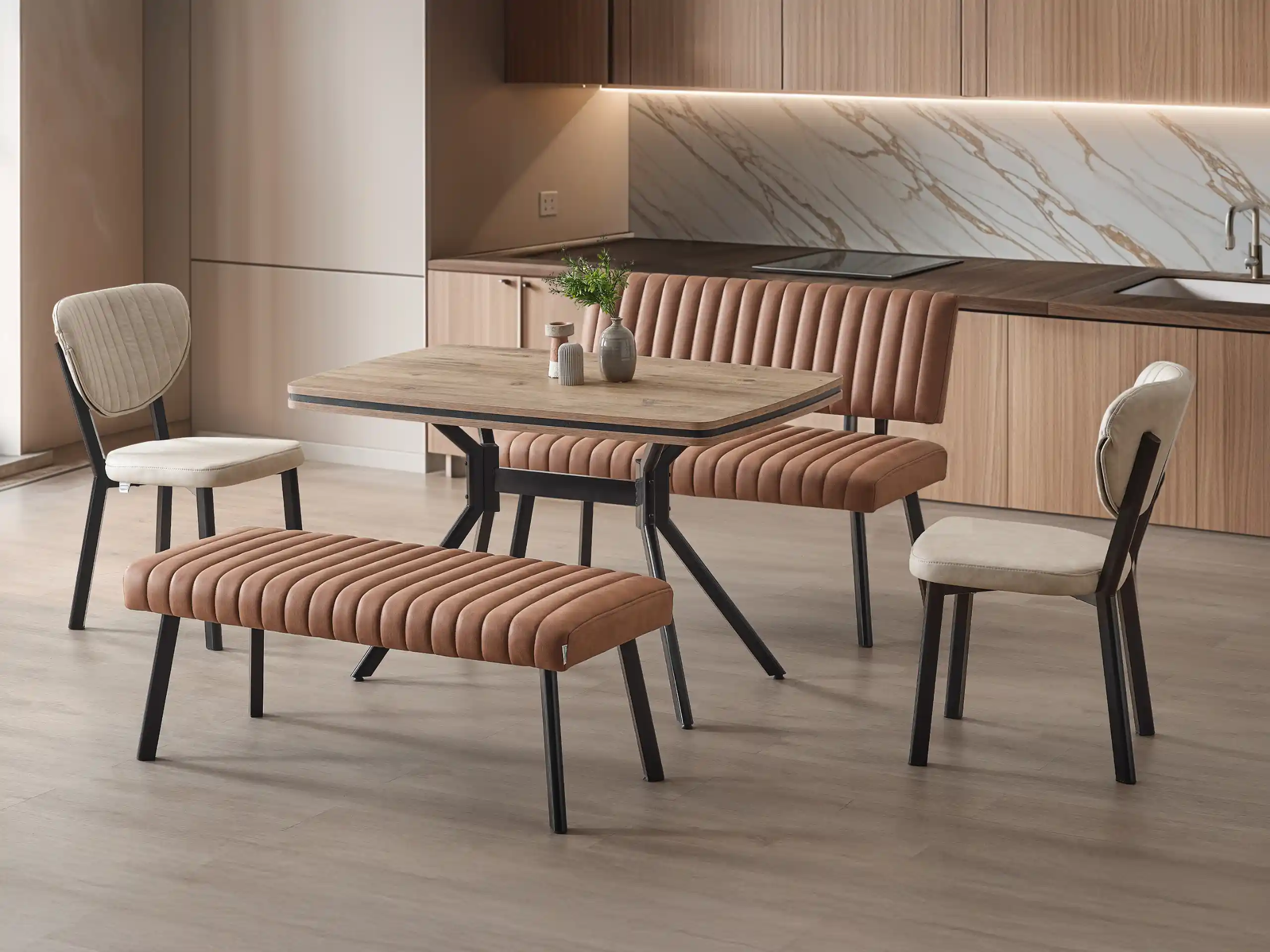 Why stick to the same old seating arrangement? The Koza Ceviz Dining Set mixes things up with a chic combination of chairs and a bench. The bench invites a more relaxed, communal vibe—perfect for kids or close friends—while the chairs offer individual comfort. All pieces feature beautiful vertical channel tufting in a cozy walnut hue, tied together by the table’s matching wood-effect top and striking spider-leg base. It’s a cohesive, designer look that adds personality and warmth to your home.