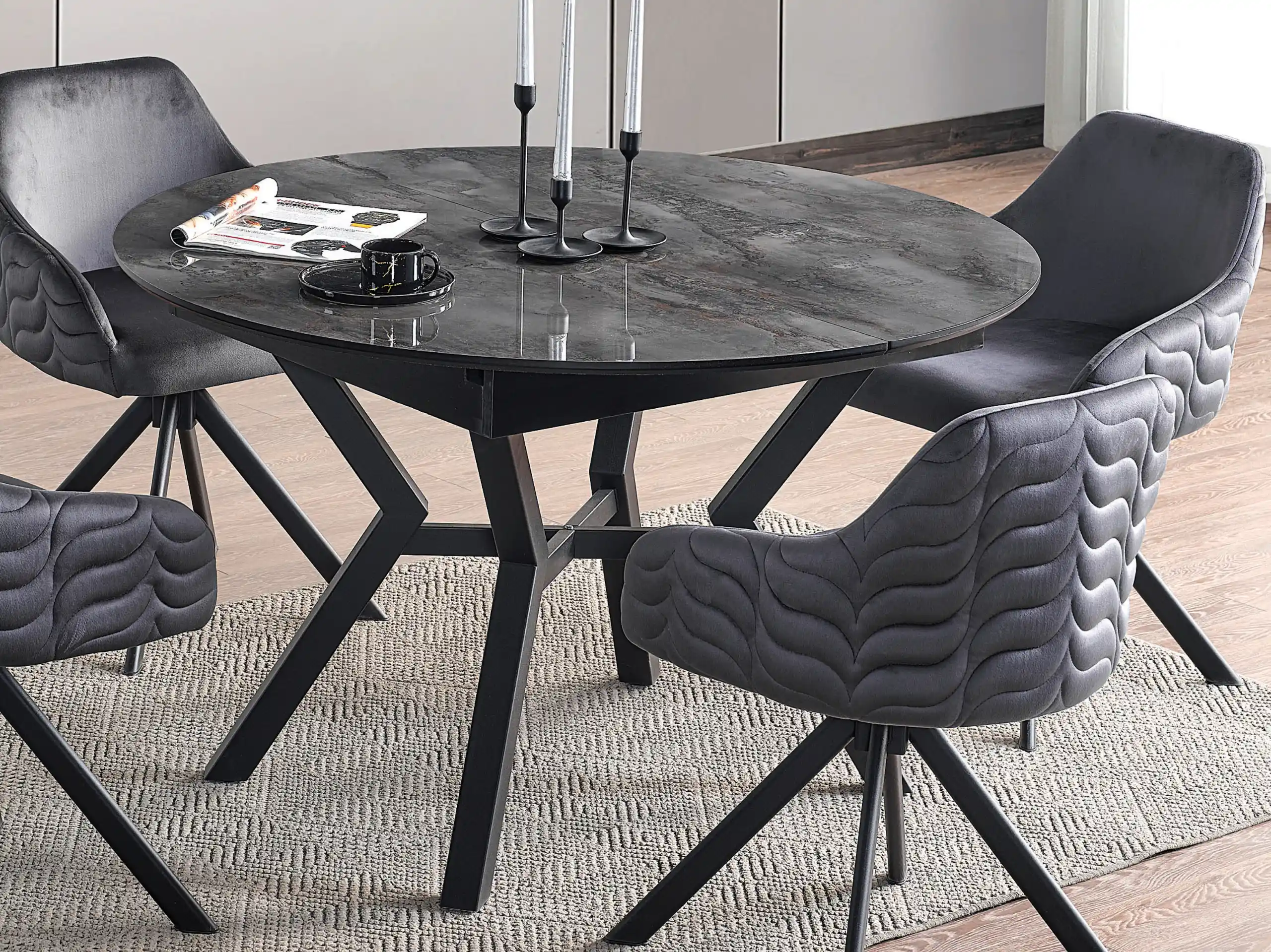 Meet the Rupa Dining Set by Mandiinteriors, crafted for contemporary families who crave sophistication, comfort, and creative living. The centerpiece is a round, luxurious stone-look table with a deep grey finish that offers versatility for meals, homework sessions, or artistic pursuits. Its sculptural black base provides architectural stability and a bold statement for modern interiors. Paired with plush Rupa chairs, the set effortlessly blends ergonomic comfort with style—the chairs feature soft velvet upholstery in charcoal, with an eye-catching wave pattern and wrapped seat for extra support during long gatherings.