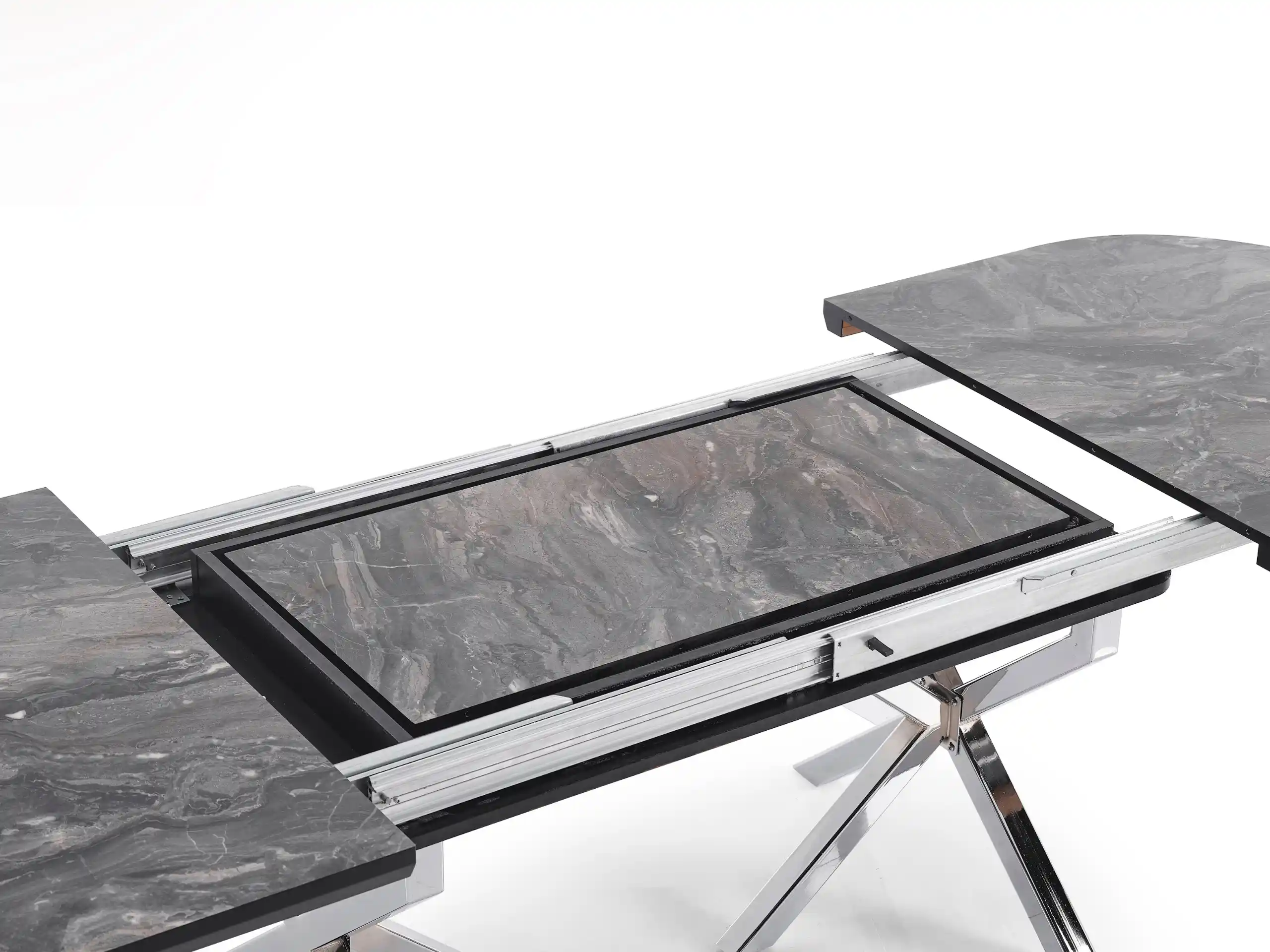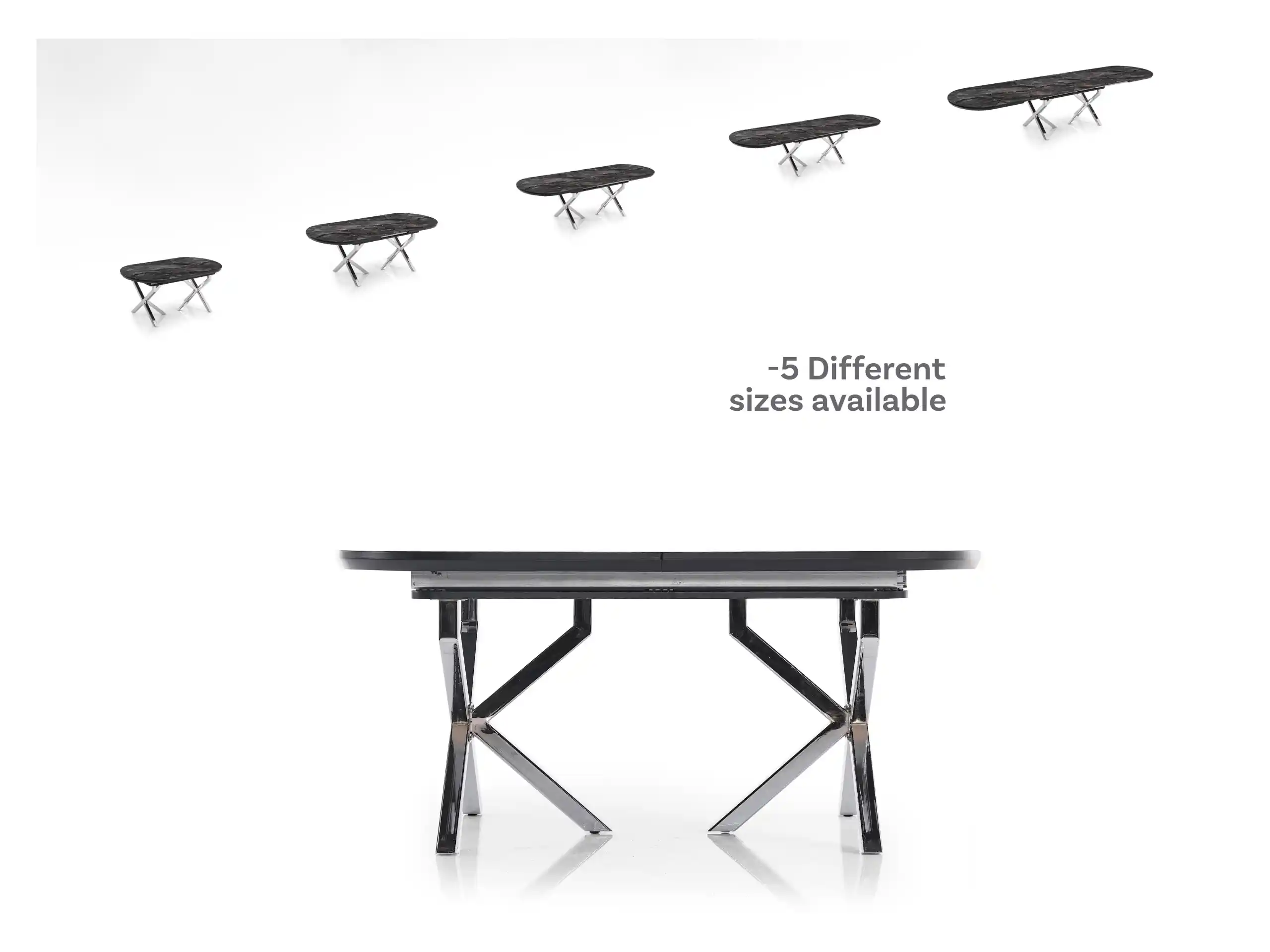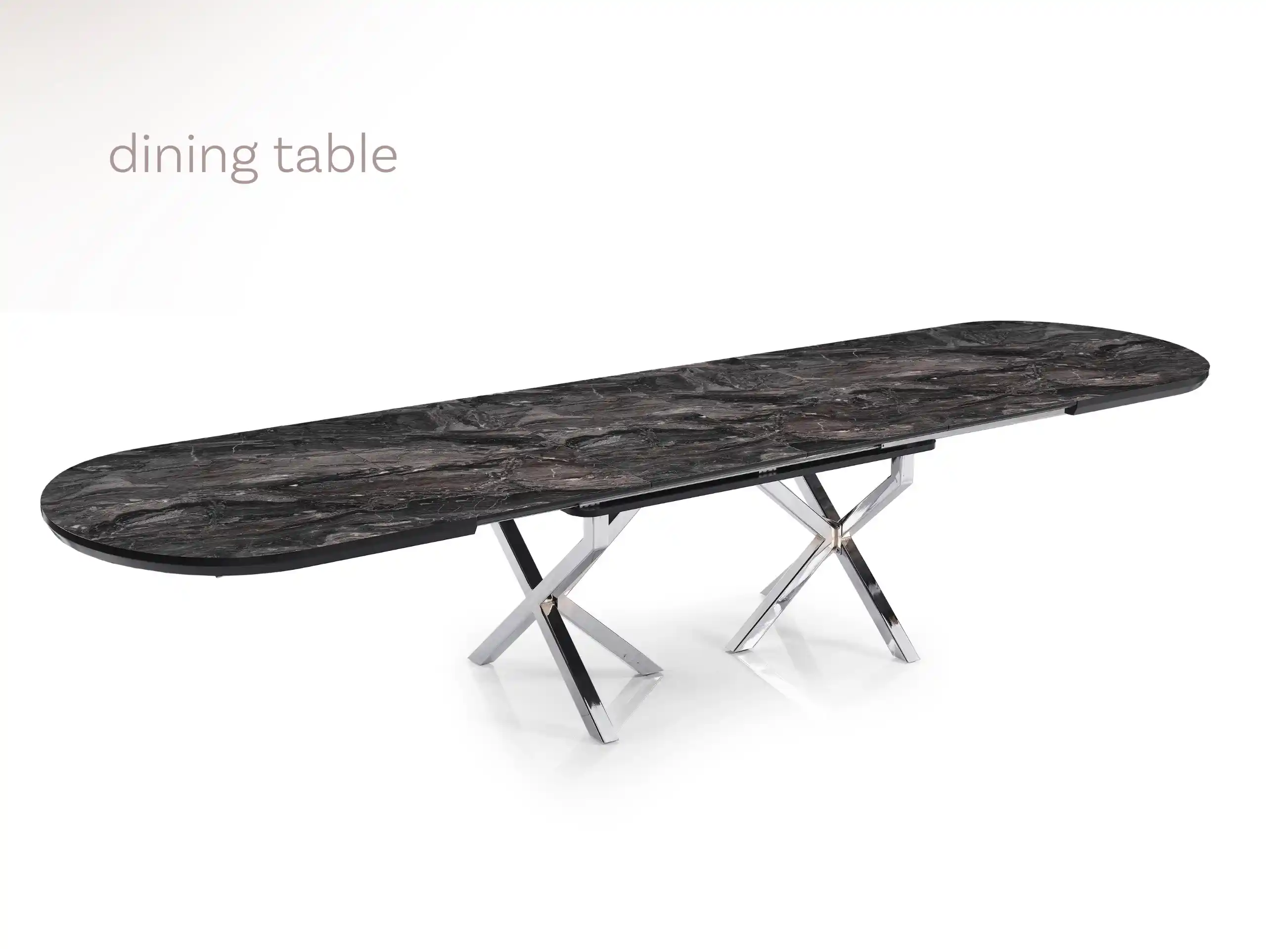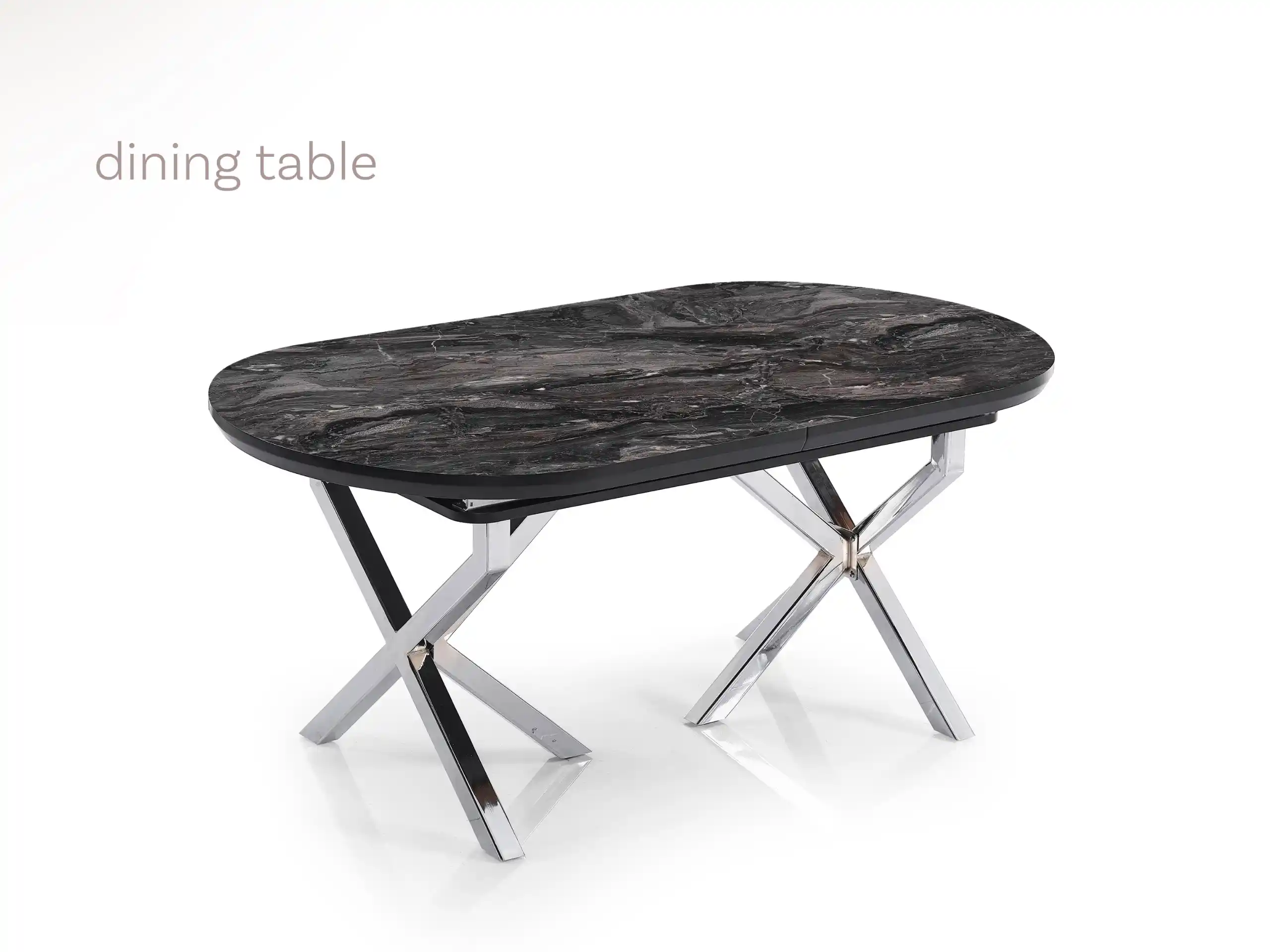 Zumrut Dining Table blends an extendable marble-look top with gleaming chrome legs—delivering versatile functionality and bold elegance for stylish modern family dining.